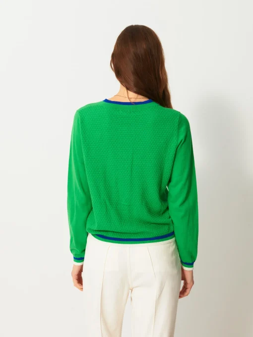 Le Pull Jamie est un cardigan en coton cachemire. Il a un col rond orné d’un bord-côte et d’une bande contrastée. La patte est boutonnée, et le bas ainsi que les bas de manches présentent un bord-côte avec trois bandes de couleur contrastée.