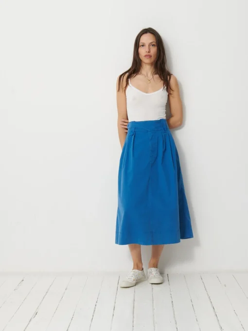 La jupe Klea est une jupe évasée en gabardine. Elle possède une braguette et des poches italiennes sur le côté devant. Sa ceinture est réglable par boutons, avec des passants attachés par boutons. Les plis sont présents sur le devant et les pinces au dos. Son ourlet est surpiqué en bas.