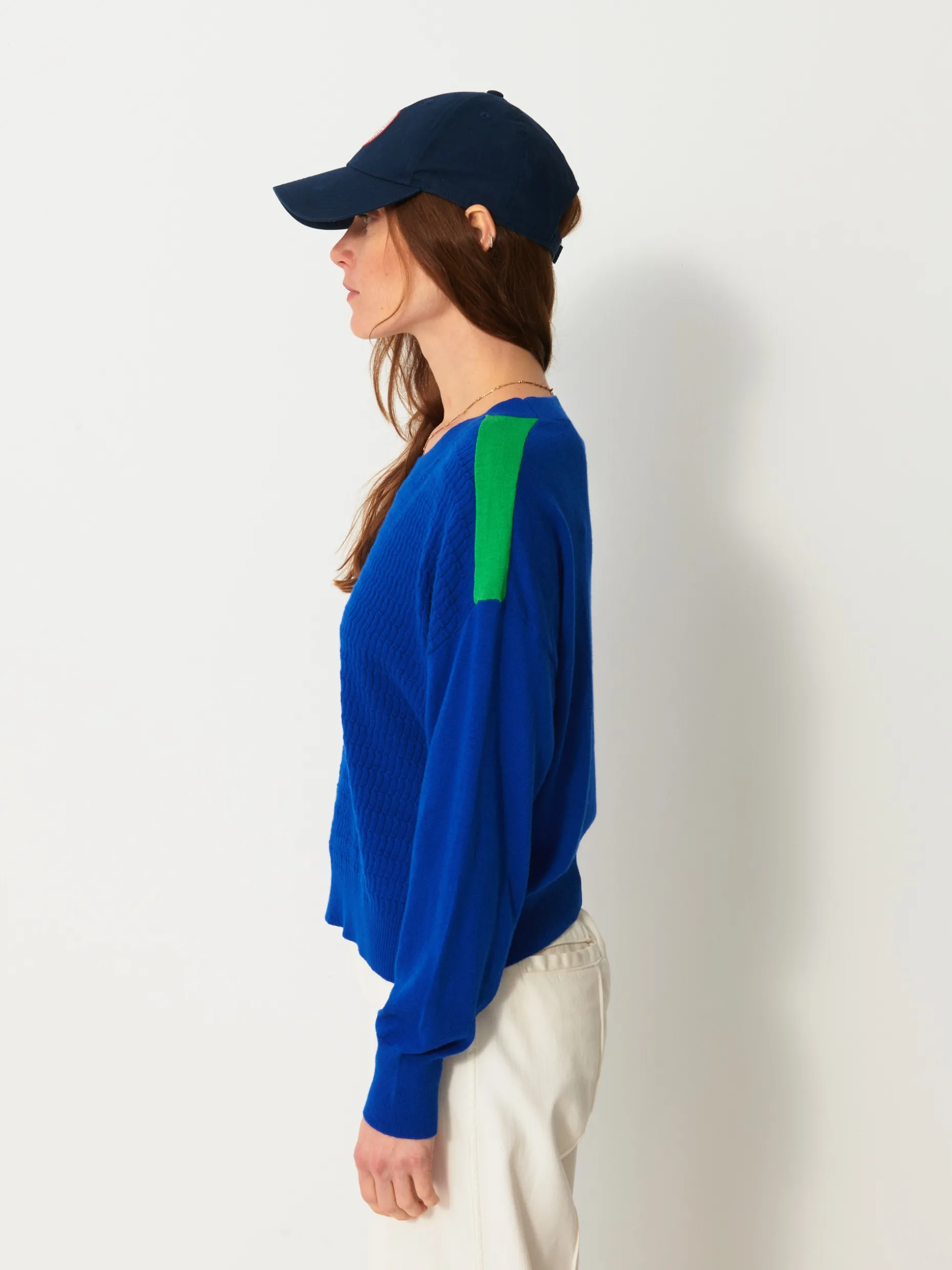 Le Pull Matheo. Pull col rond avec point fantaisie. Volume carré, droit et loose. Bande de couleur contrastée aux épaules et sous le bas.