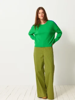 Le Pull Matheo. Pull col rond avec point fantaisie. Volume carré, droit et loose. Bande de couleur contrastée aux épaules et sous le bas.