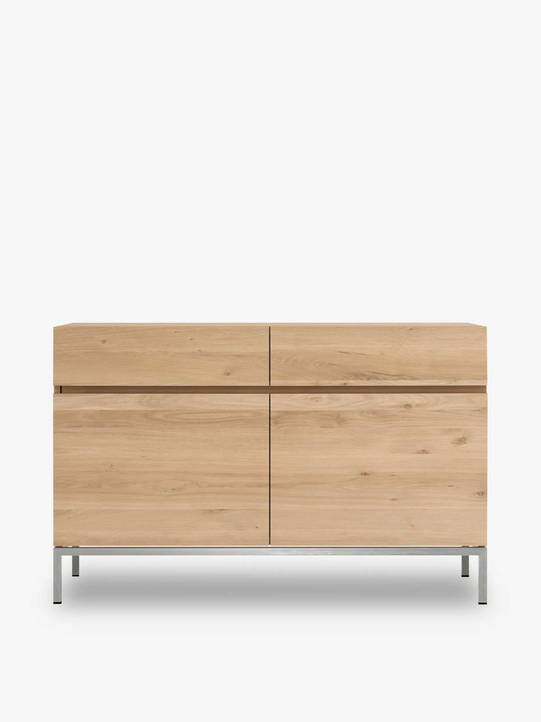 La collection Ligna propose une série de meubles de rangement au look épuré et minimaliste. Le corps en chêne massif repose sur un piètement droit. Ce buffet doté de deux portes et de deux tiroirs optimise vos besoins dans le salon, la cuisine ou la chambre en passant par le bureau. Dans un souci de beauté authentique, le bois sélectionné au sein de forêts européennes peut contenir des noeuds et des fissures naturelles qui font de chaque meuble une pièce unique. Disponible en plusieurs tailles.