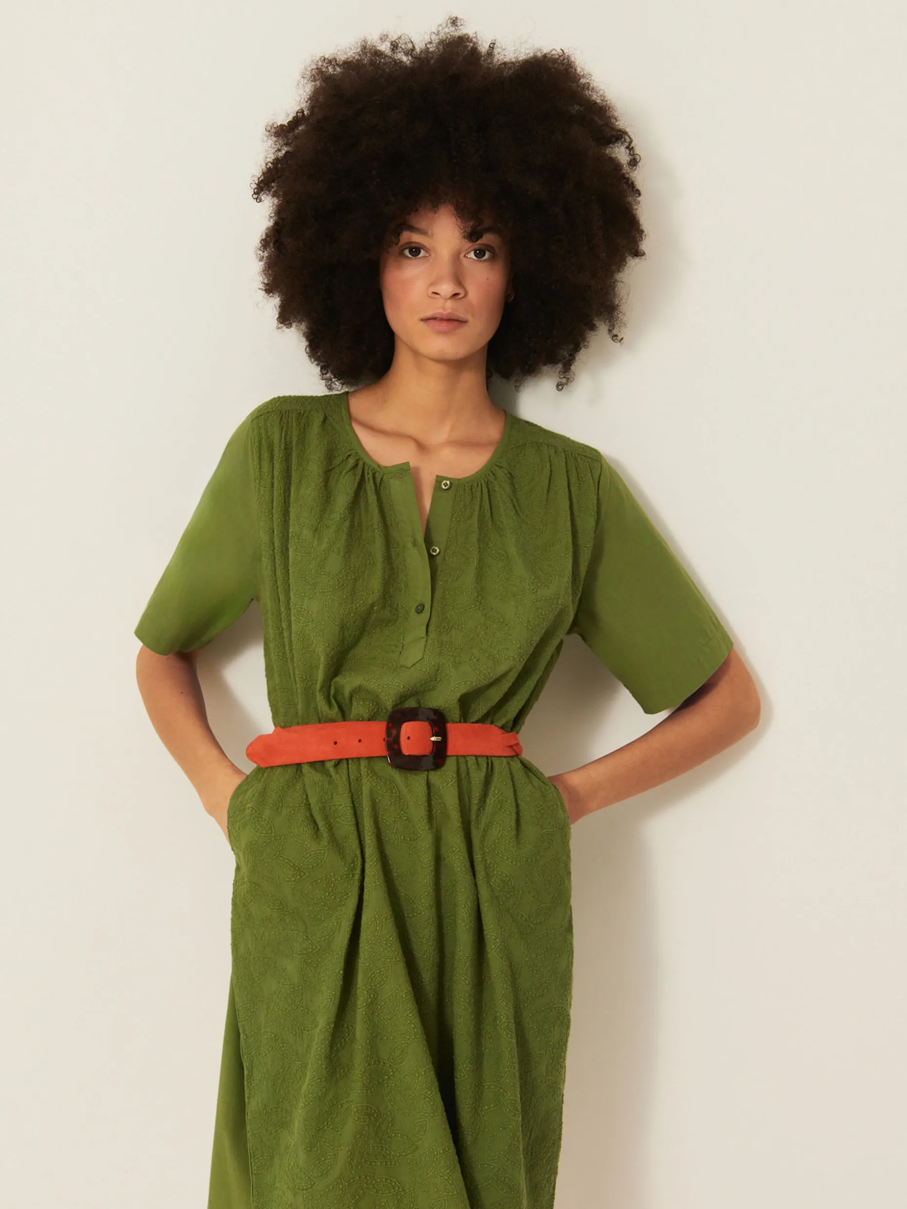Fabriquée à la main avec le plus grand soin dans notre atelier en Espagne, cette ceinture en veau velours compte bien twister tous vos looks. Couleur éclatante et large bride motif écaille, c’est l’alliance parfaite pour upgrader n’importe quel combo t-shirt blanc / jupe en jean.
