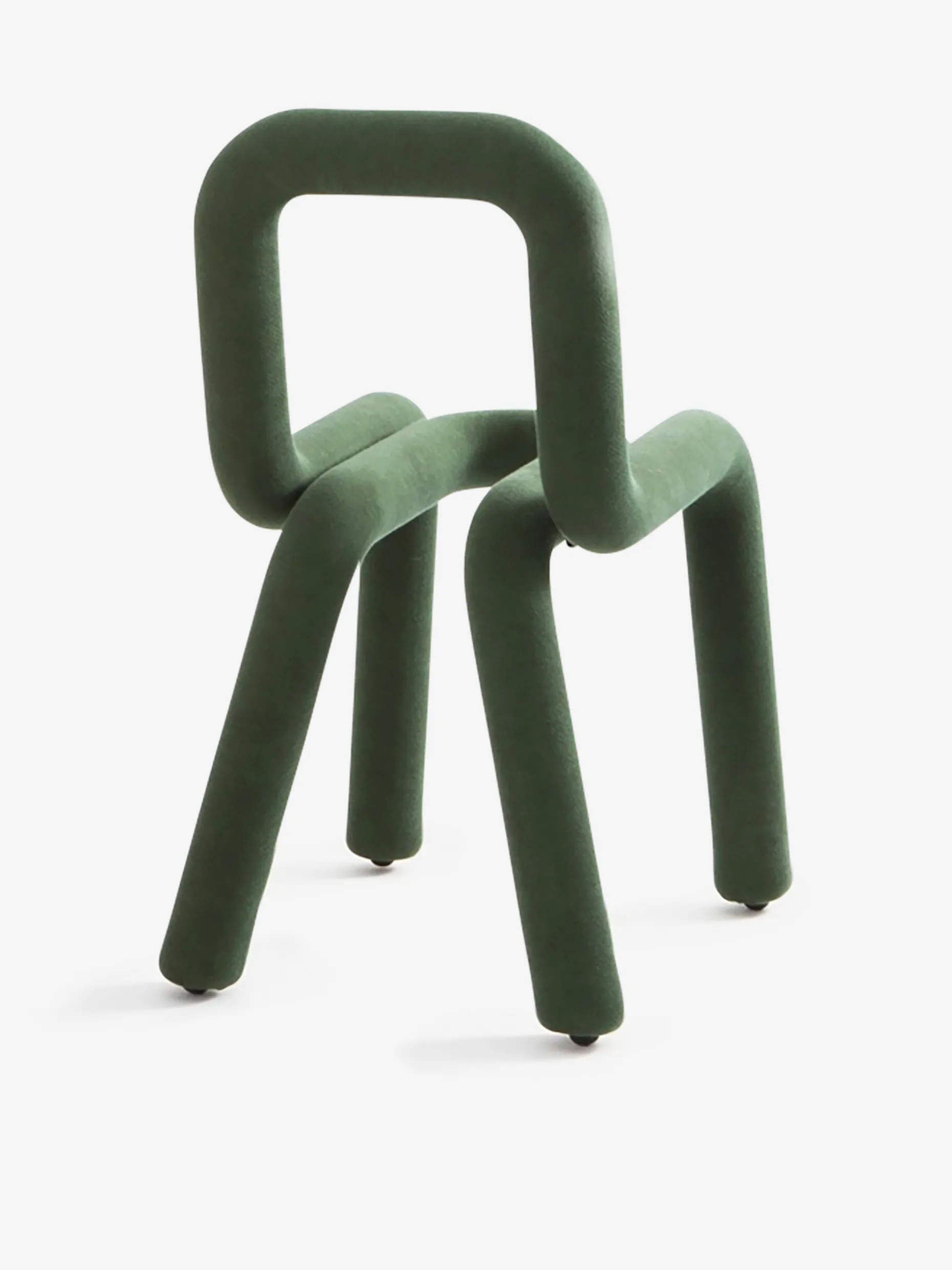 Composée de 2 parties tubulaires en métal imbriquées l’une dans l’autre, la chaise Bold réactualise la tradition de la chaise en tube d’acier. Gonflée d’une épaisse mousse de polyuréthane, la ligne tracée par la Bold joue successivement le rôle de pied, siège puis dossier et lui apporte un confort étonnant. D’un seul trait, à la manière de la Linea d’Osvaldo Cavandoli et épaissie telle la police de caractère à laquelle on applique une graisse, la chaise Bold réussit à faire l’économie de siège et de dossier. Recouverte d’un gainage textile déhoussable et lavable la chaise Bold change de couleur en quelques instants.