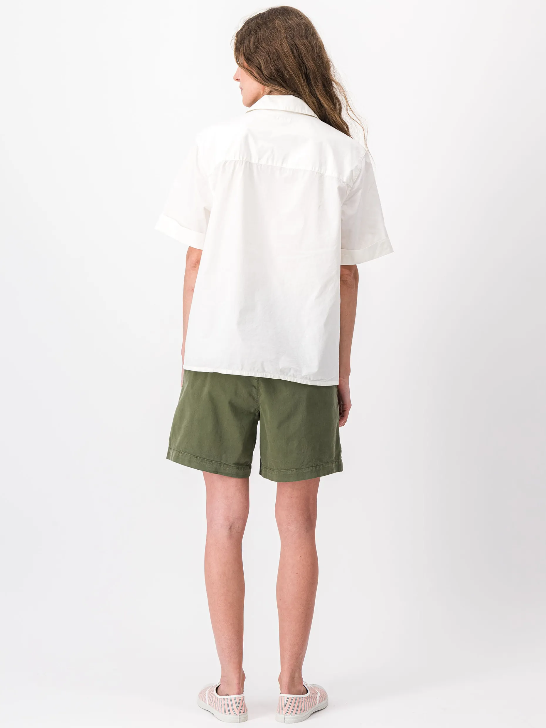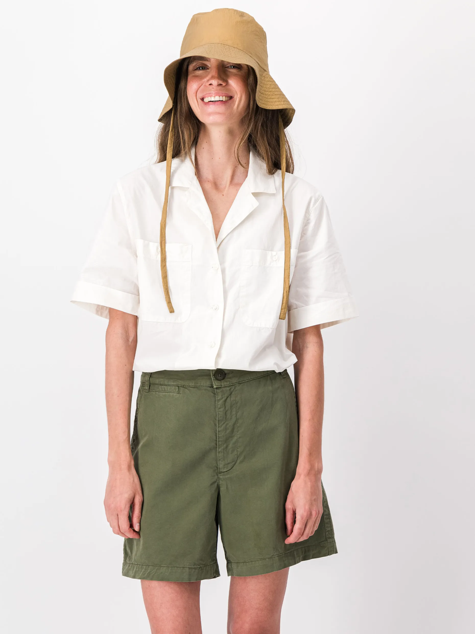 Montée au Maroc dans une popeline craquante de coton, en prête à teindre, la chemise Hawai est d’abord de couleur écrue puis est teinte une fois totalement montée. C’est ce qui lui confère un effet légèrement irrégulier au niveau des coutures, une touche vintage que l’on adore. Les boutons sont gravés Bensimon. Côté coupe, on est sur un iconique du vestiaire Bensimon. Une chemise qui reprend les codes de la saharienne, tout-à-fait dans l’esprit safari. Décolleté croisé et poches plaquées au niveau de la poitrine, on signe ici un essentiel de la saison que l’on associe aussi bien à sa pièce en denim fétiche qu’à une jupe longue vaporeuse.