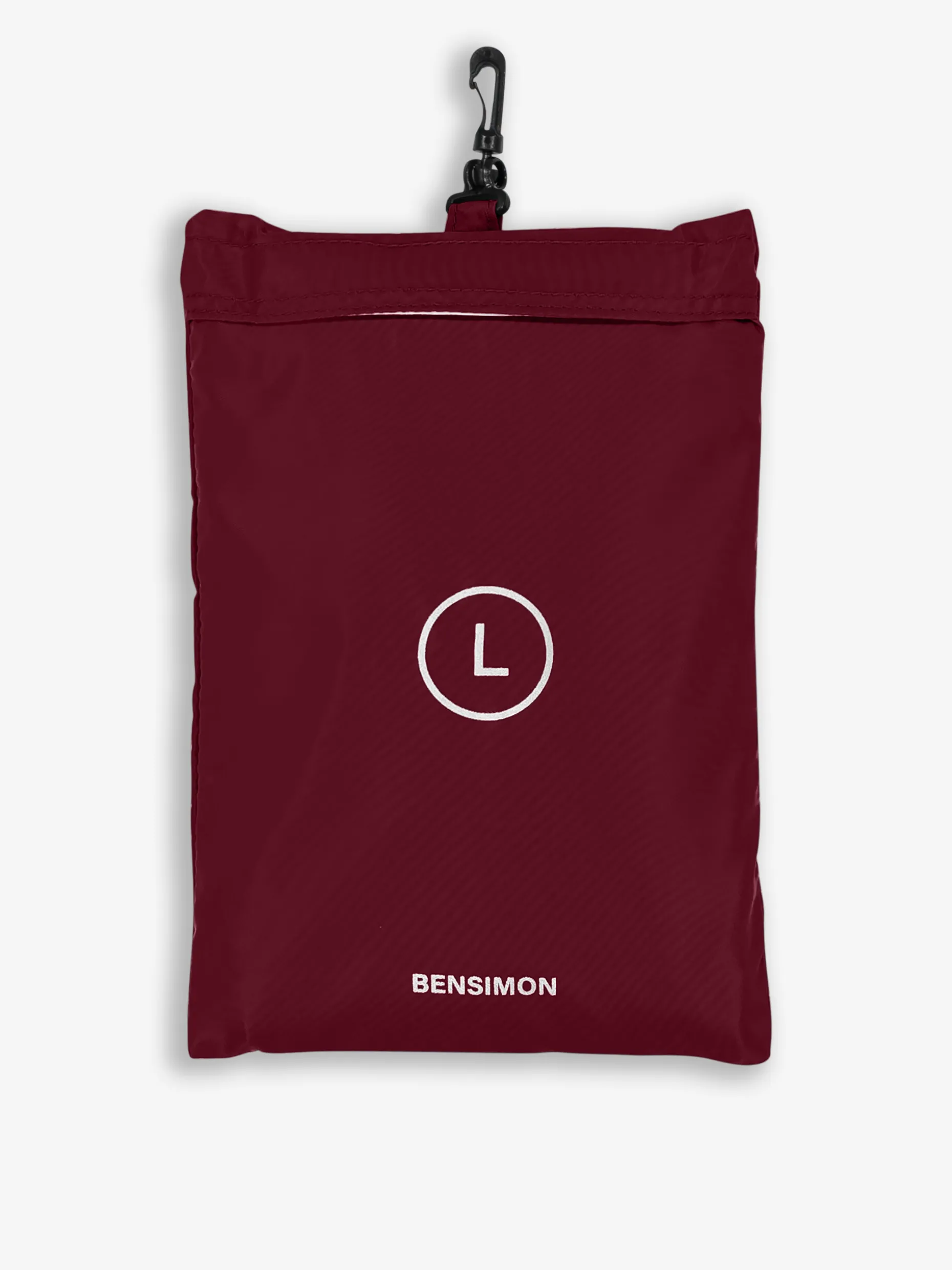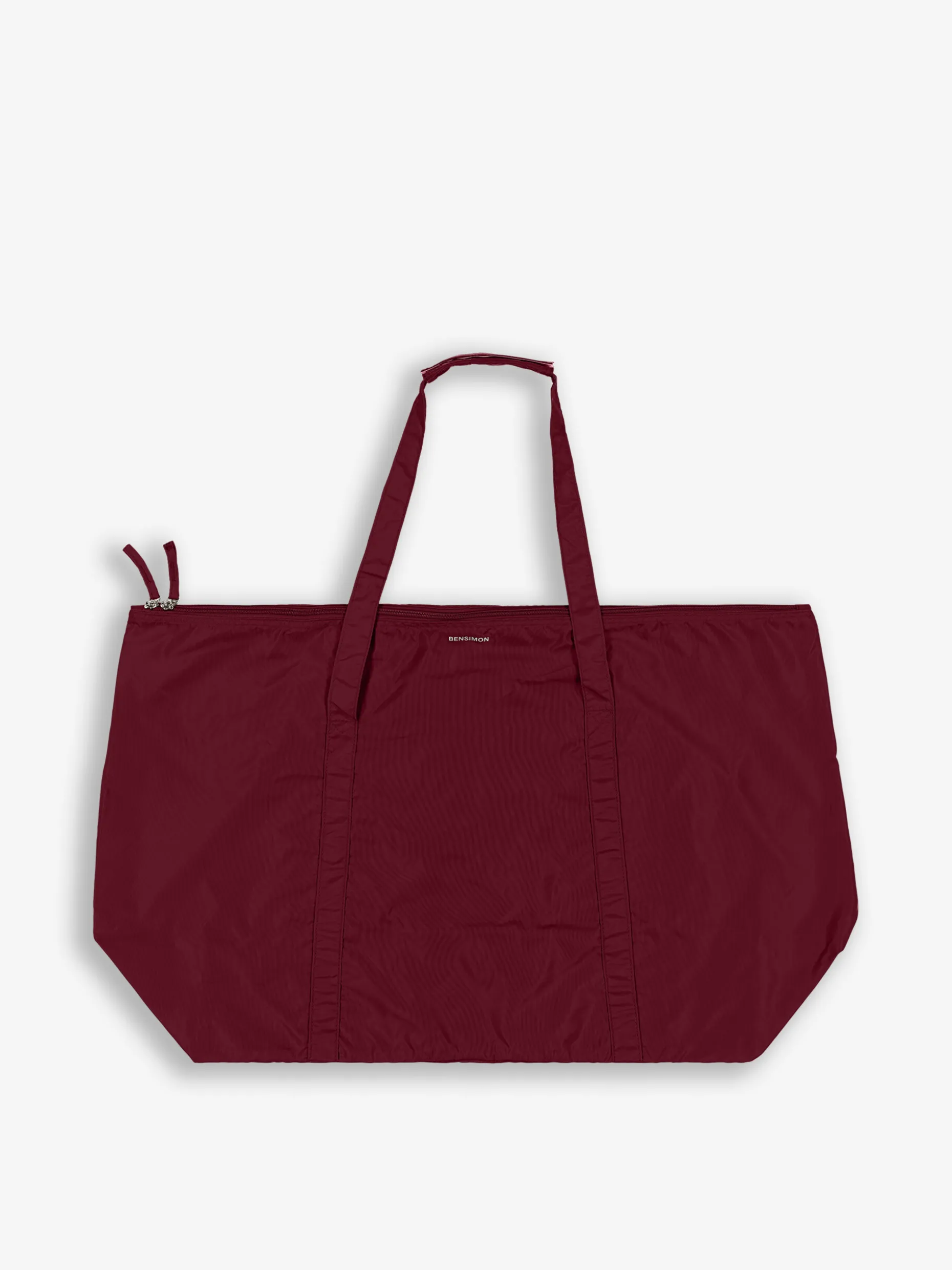 Sac à grande contenance rétractable dans une petite pochette. Fermeture zippée. Dimensions : 56 x 28 x 45 cm.