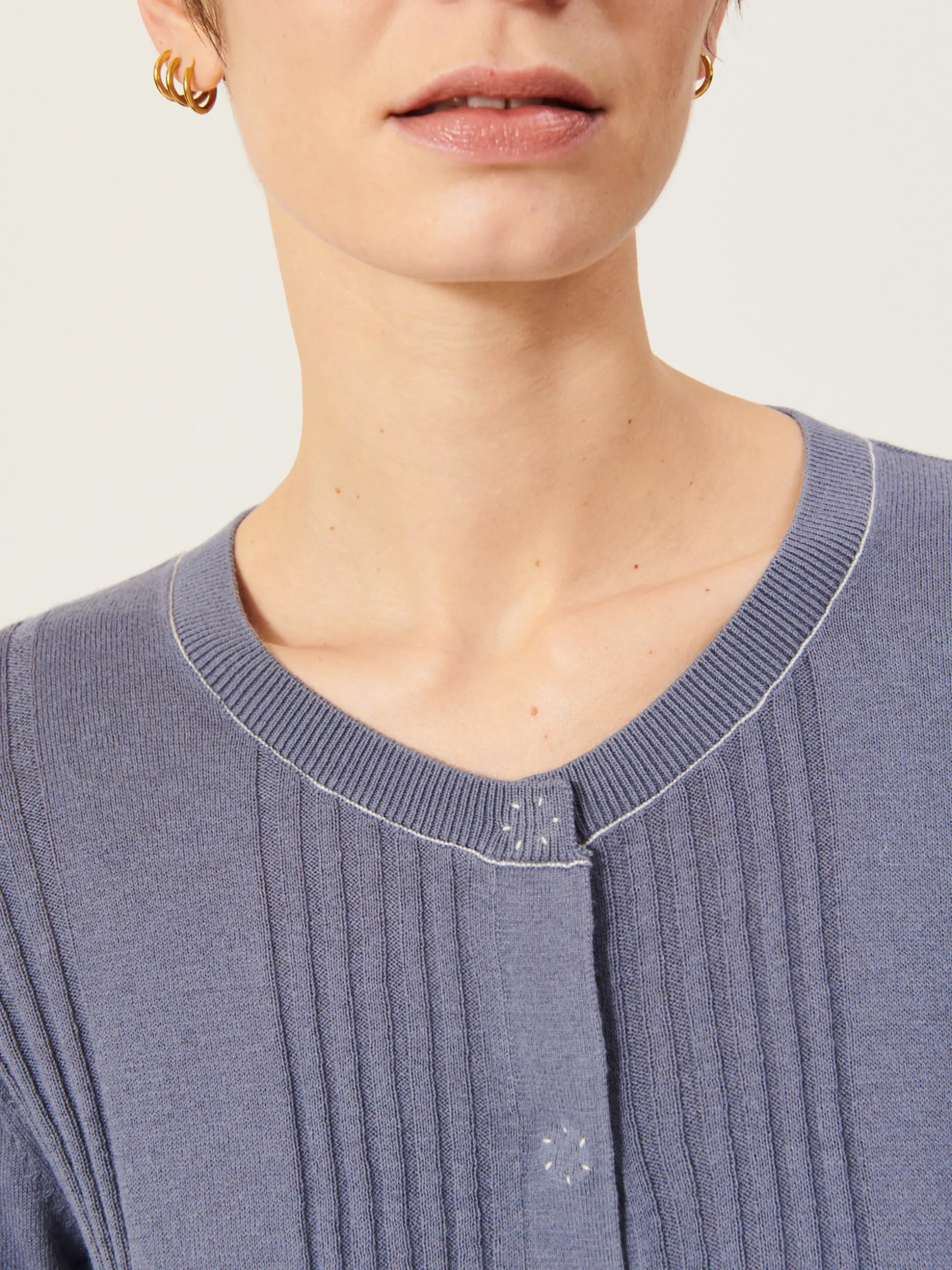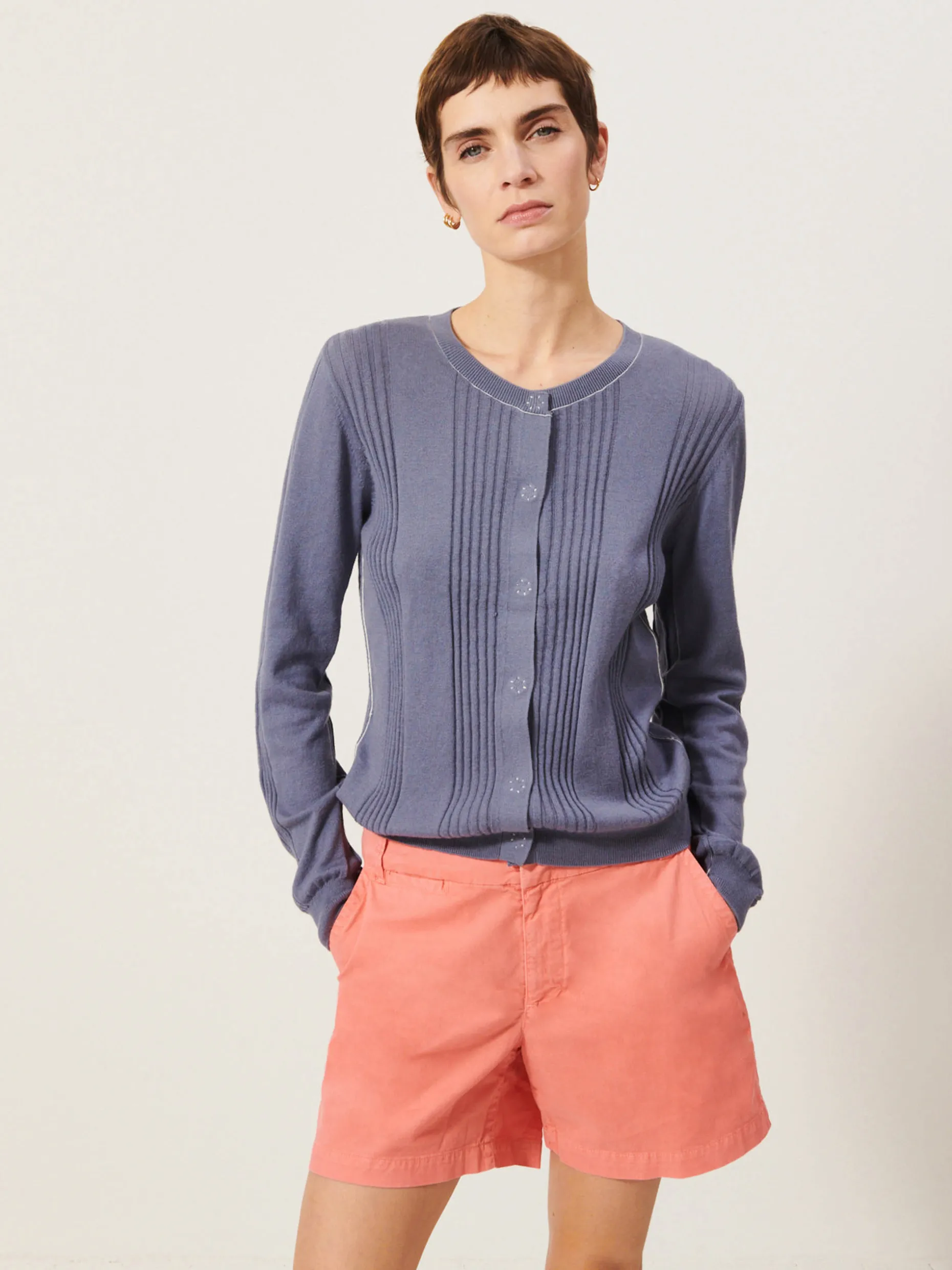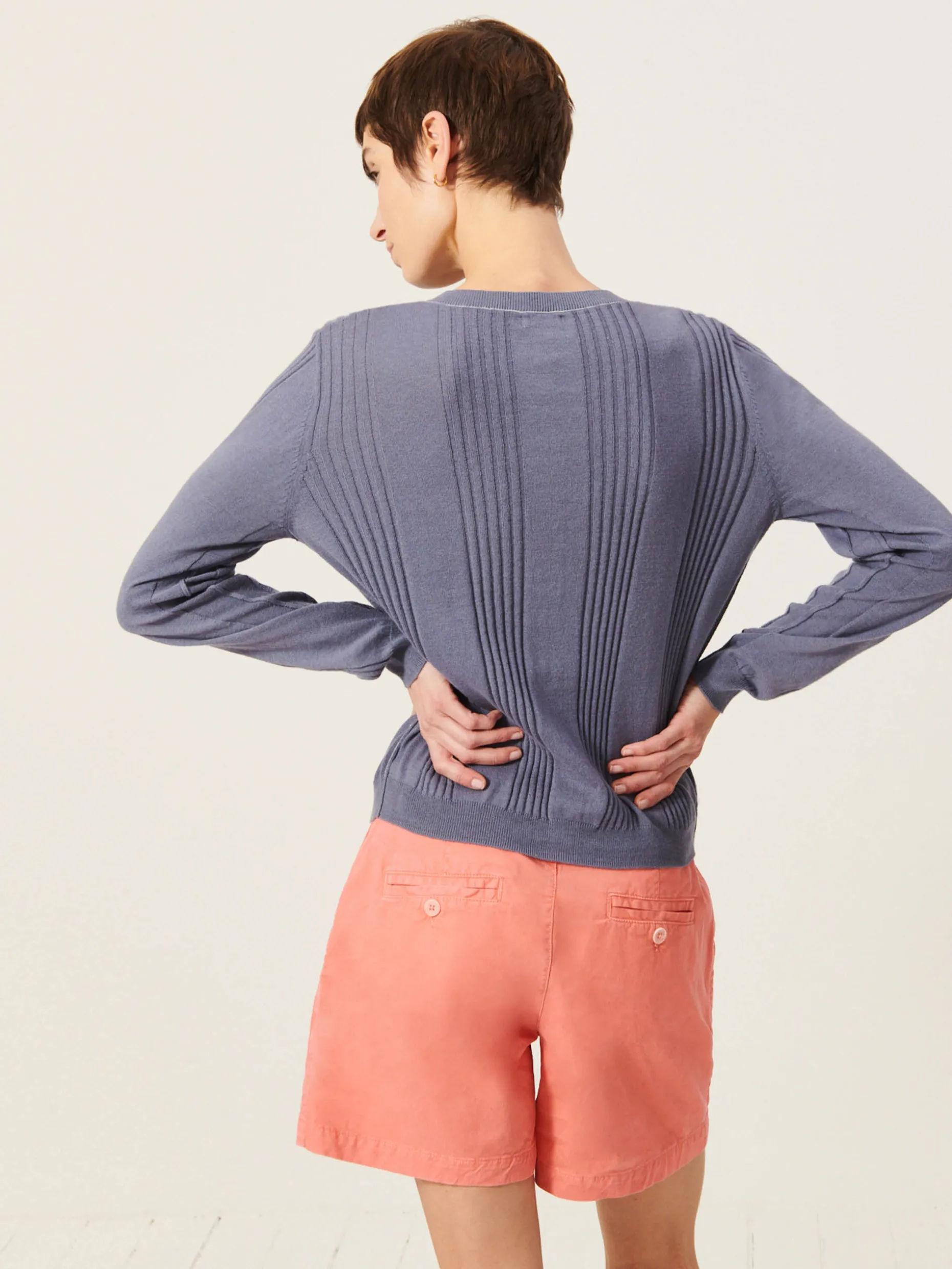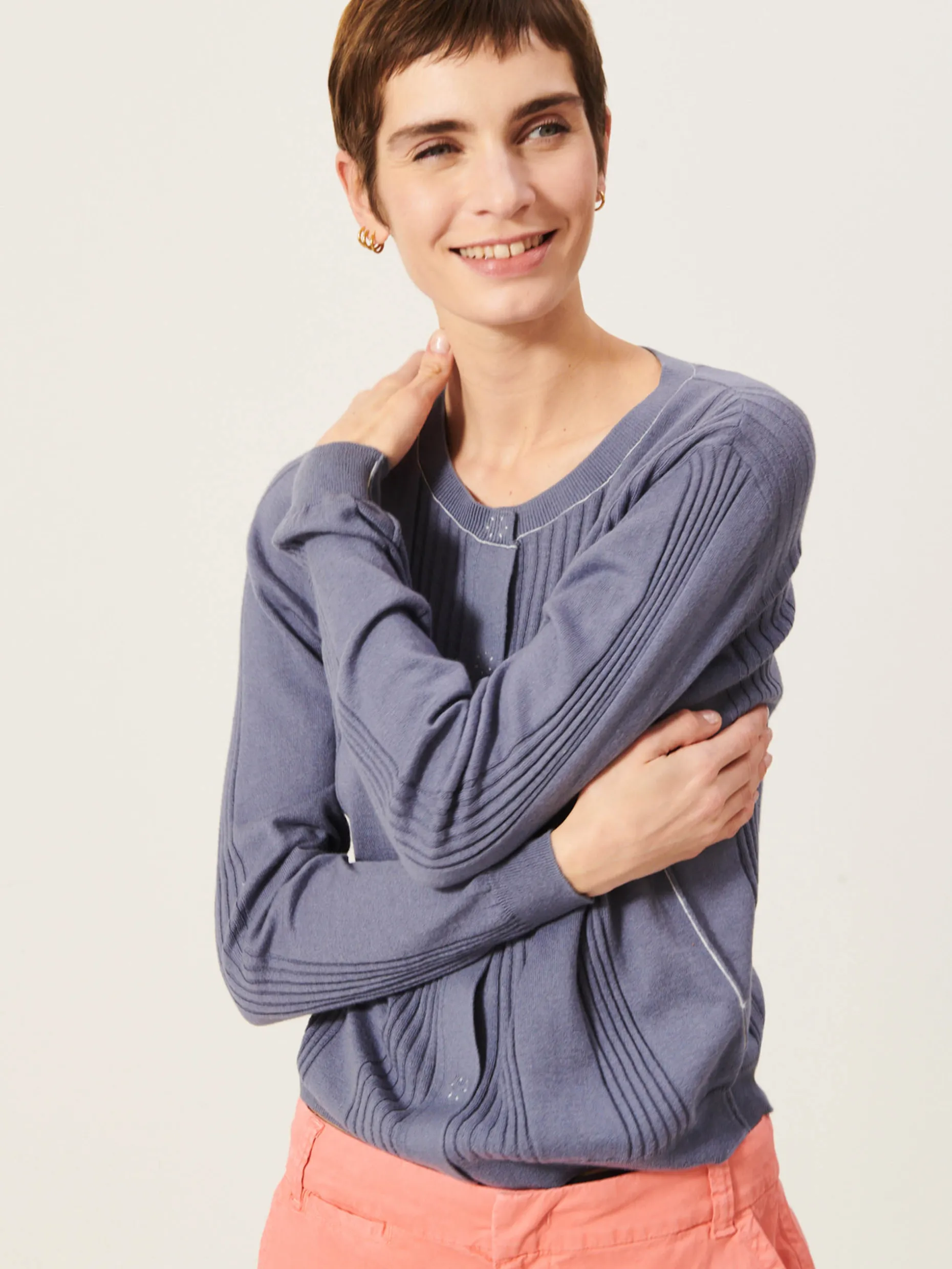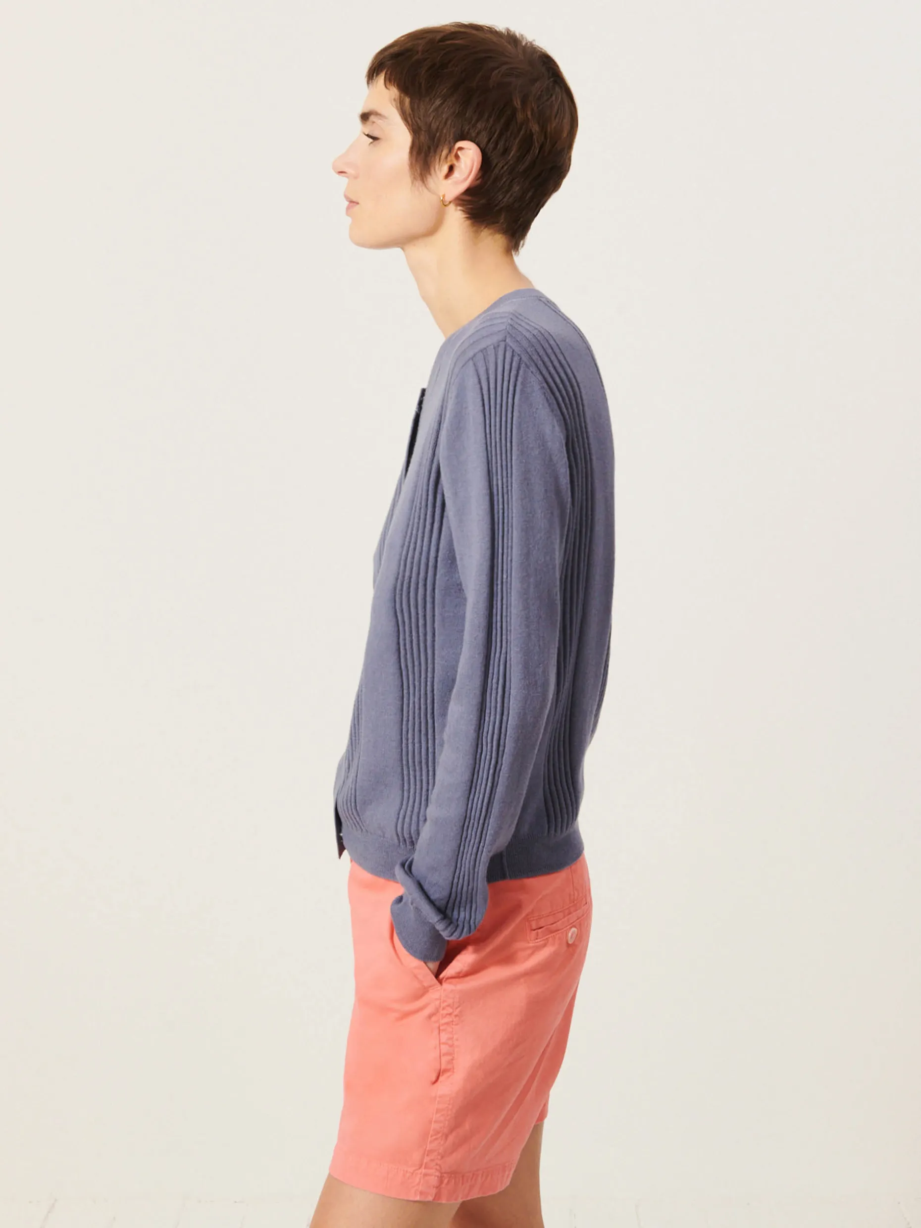 Quand les températures se rafraichissent, votre meilleur allié s’appelle Jamie. Un cardigan qui allie coton et cachemire pour être réconfortant un soir d’été. Son détail bord cote apporte beaucoup de caractère à la silhouette. Un détail qui ne passe pas inaperçu et crée le coup de coeur au premier regard.