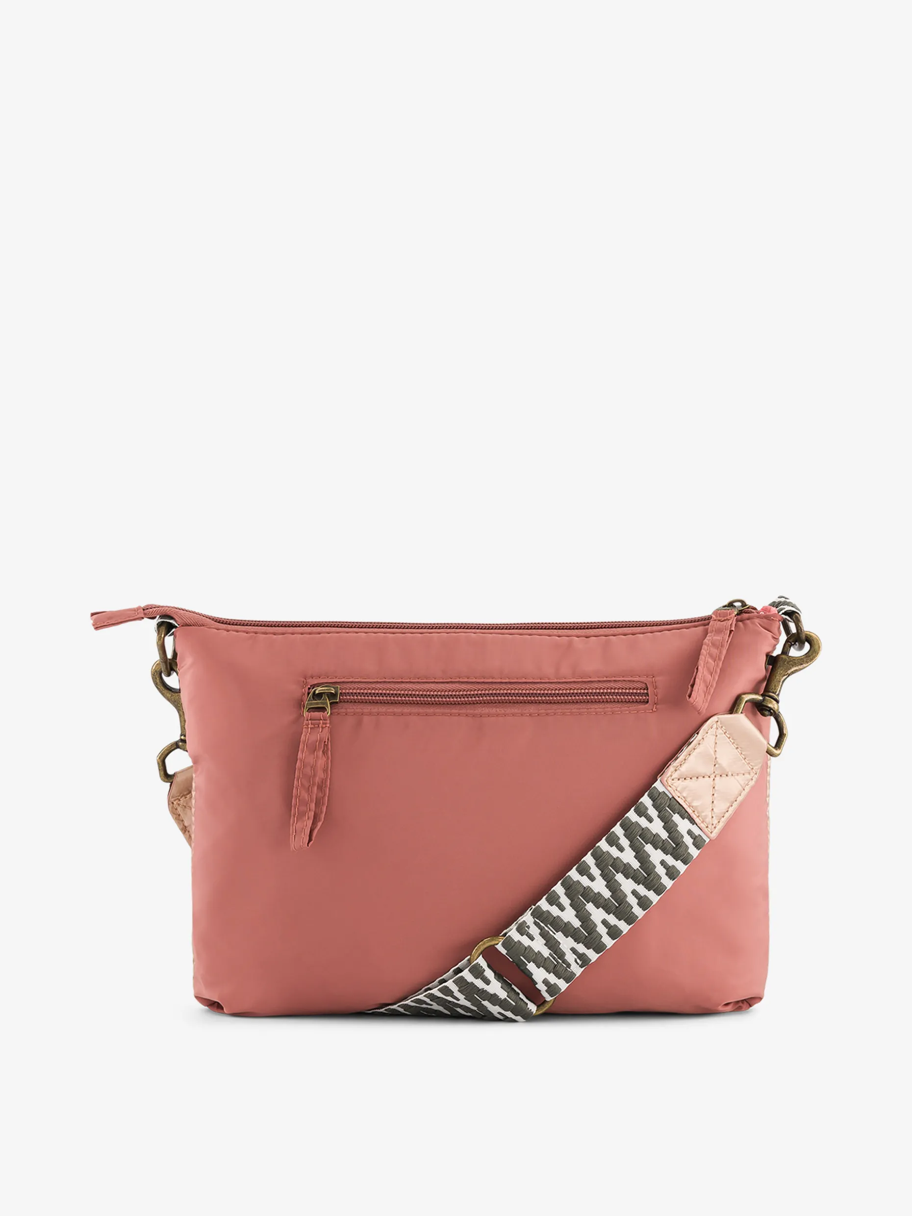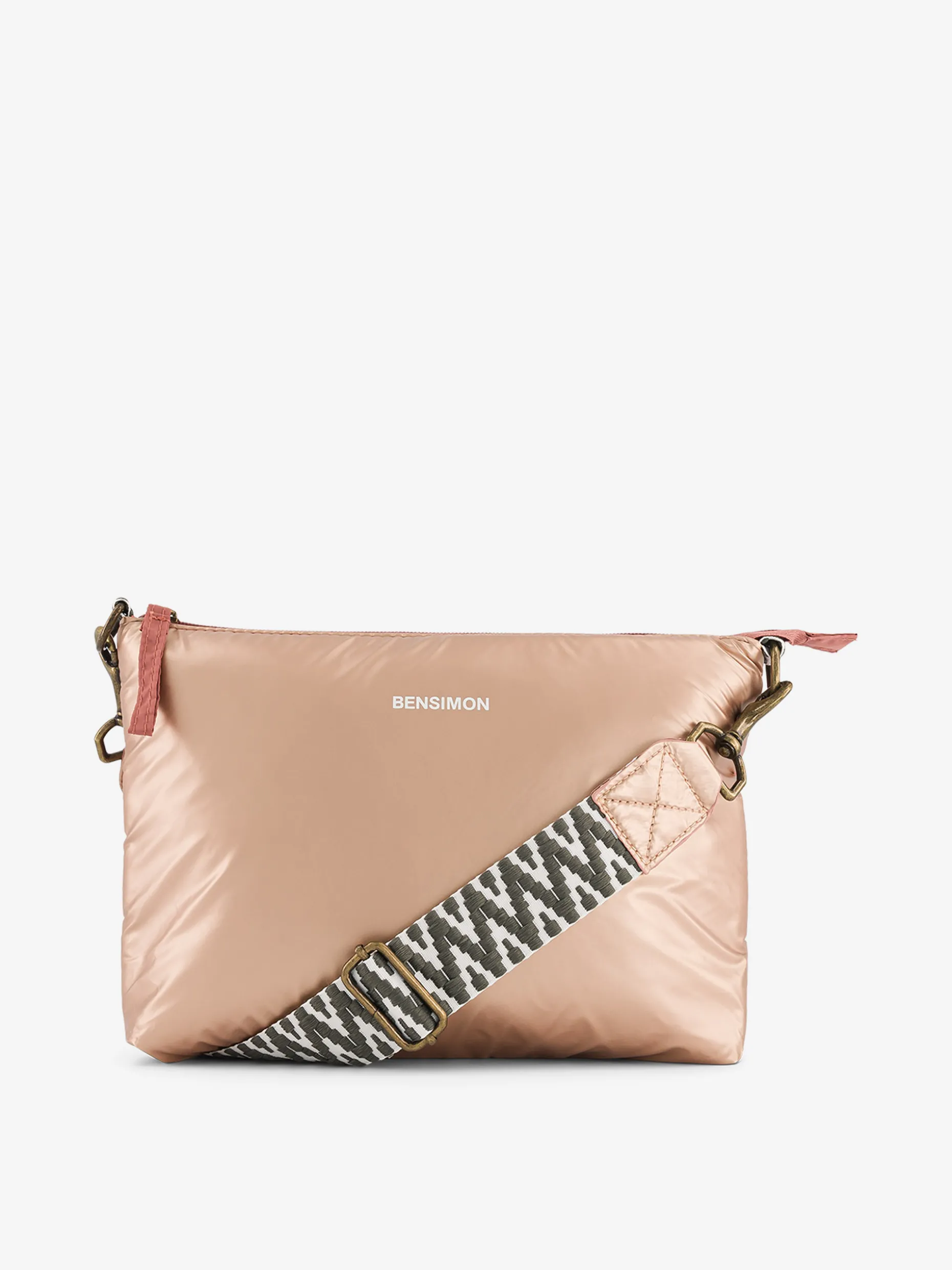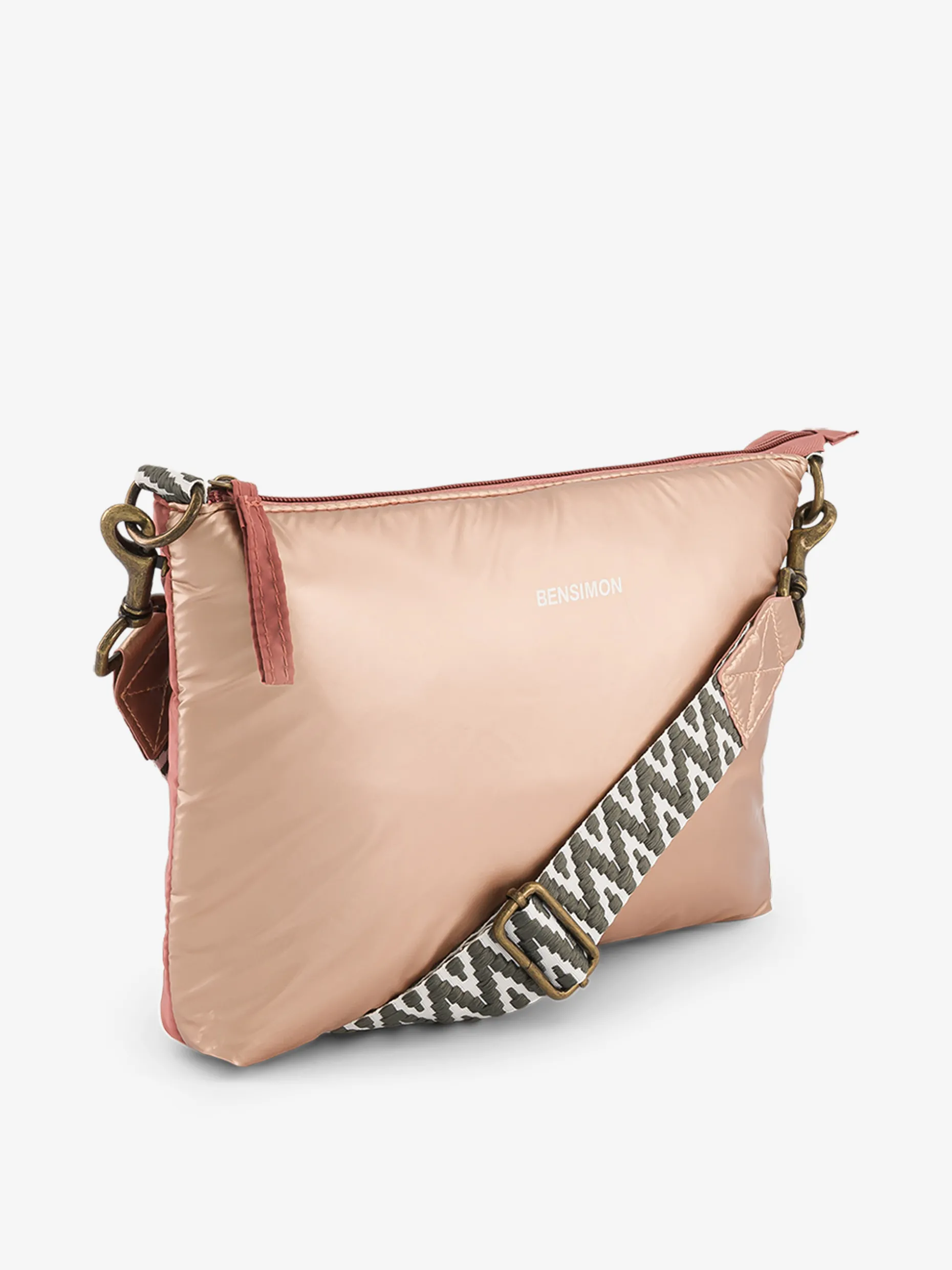 Ligne minimaliste et design épuré, cette new besace twiste n’importe quelle silhouette estivale grâce à son mix and match de matières. D’un côté, un tissu satiné. De l’autre, une touche irisée subtile qui égaye tout sur son passage. Ajoutez à cela une anse bandoulière fantaisie réglable et vous tenez le sac qui ne va pas vous quitter de la saison. Un it-bag !