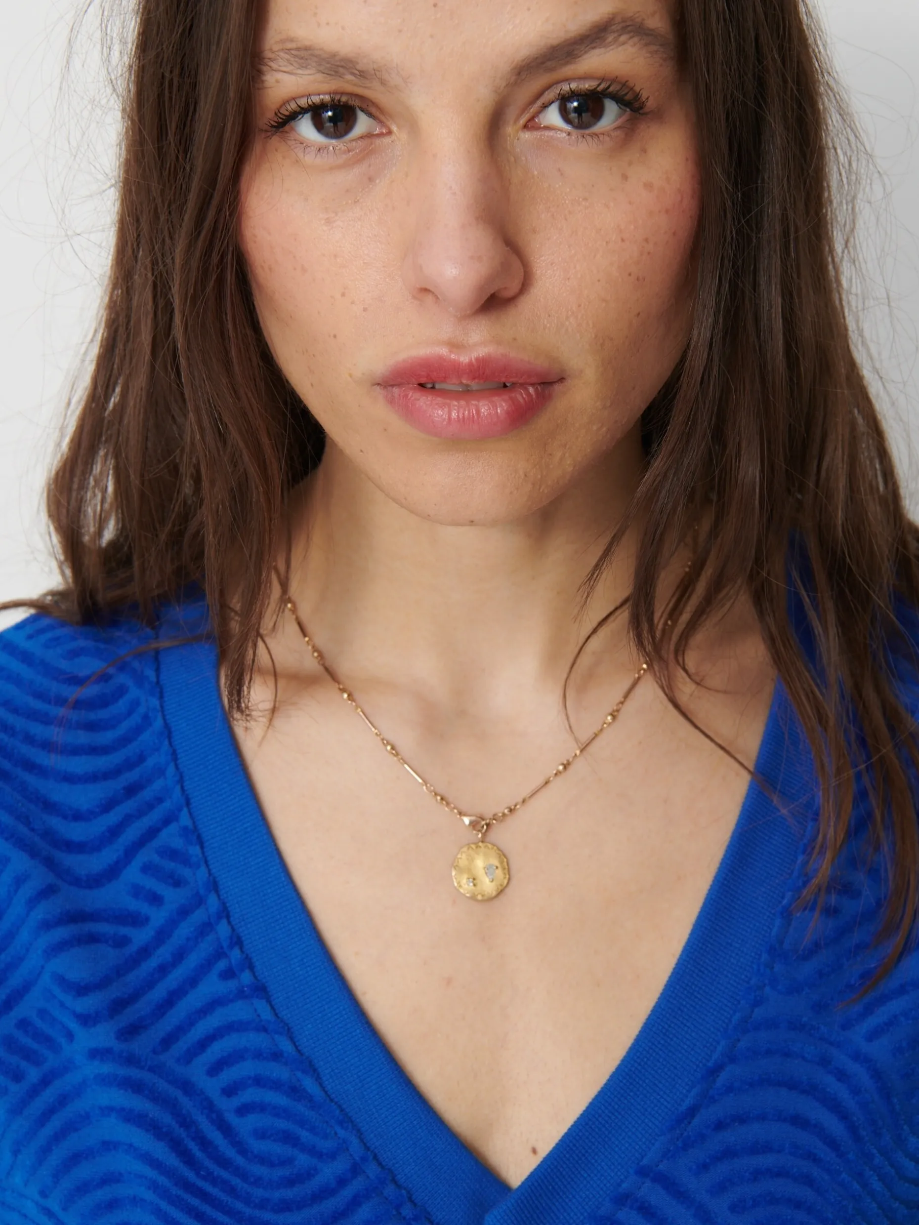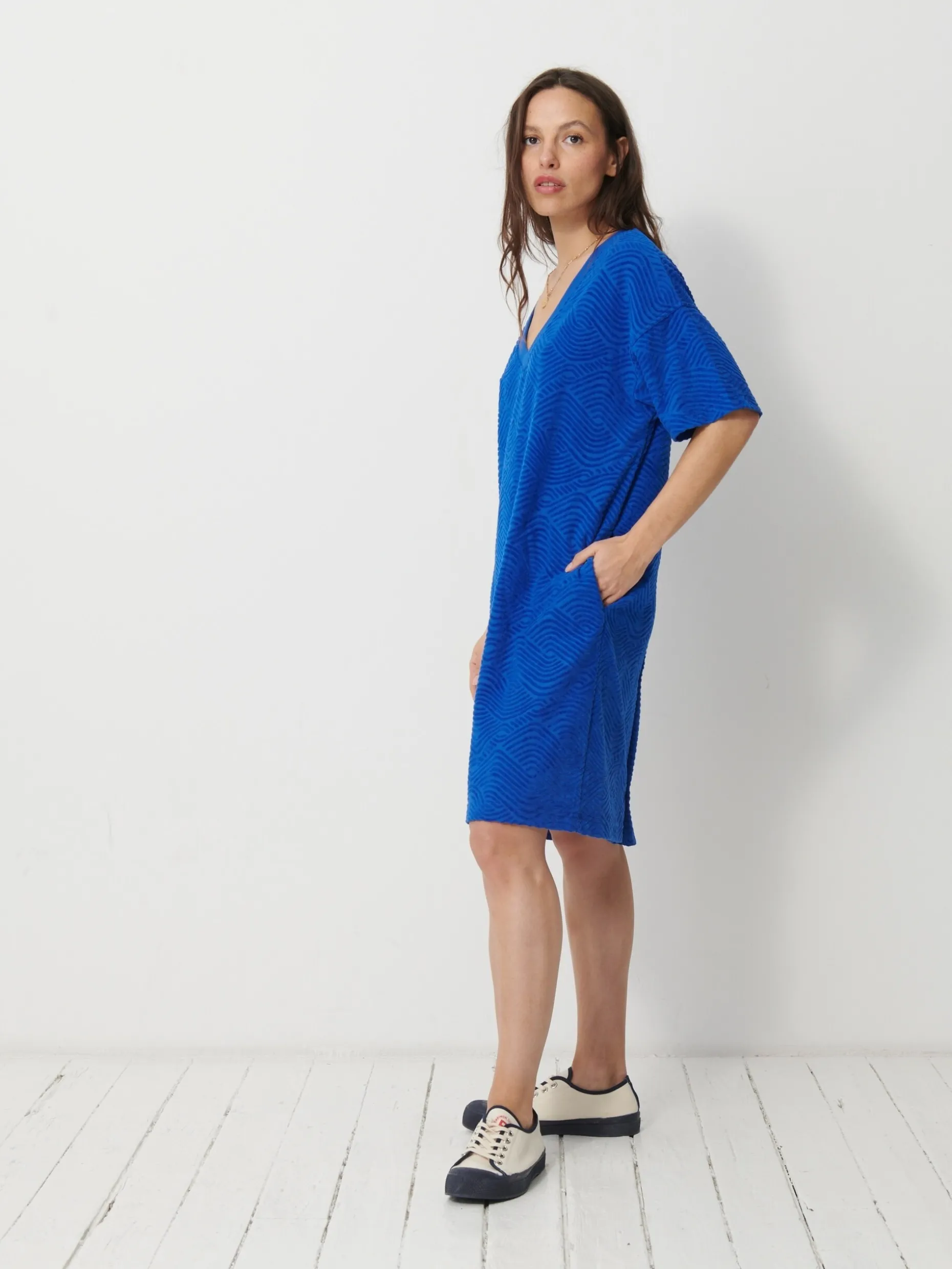 Robe Loanelle en éponge fantaisie. Col en V avec bord côte. Manches courtes. Poches passepoilées avec surpiqûres visibles au fond de poche.