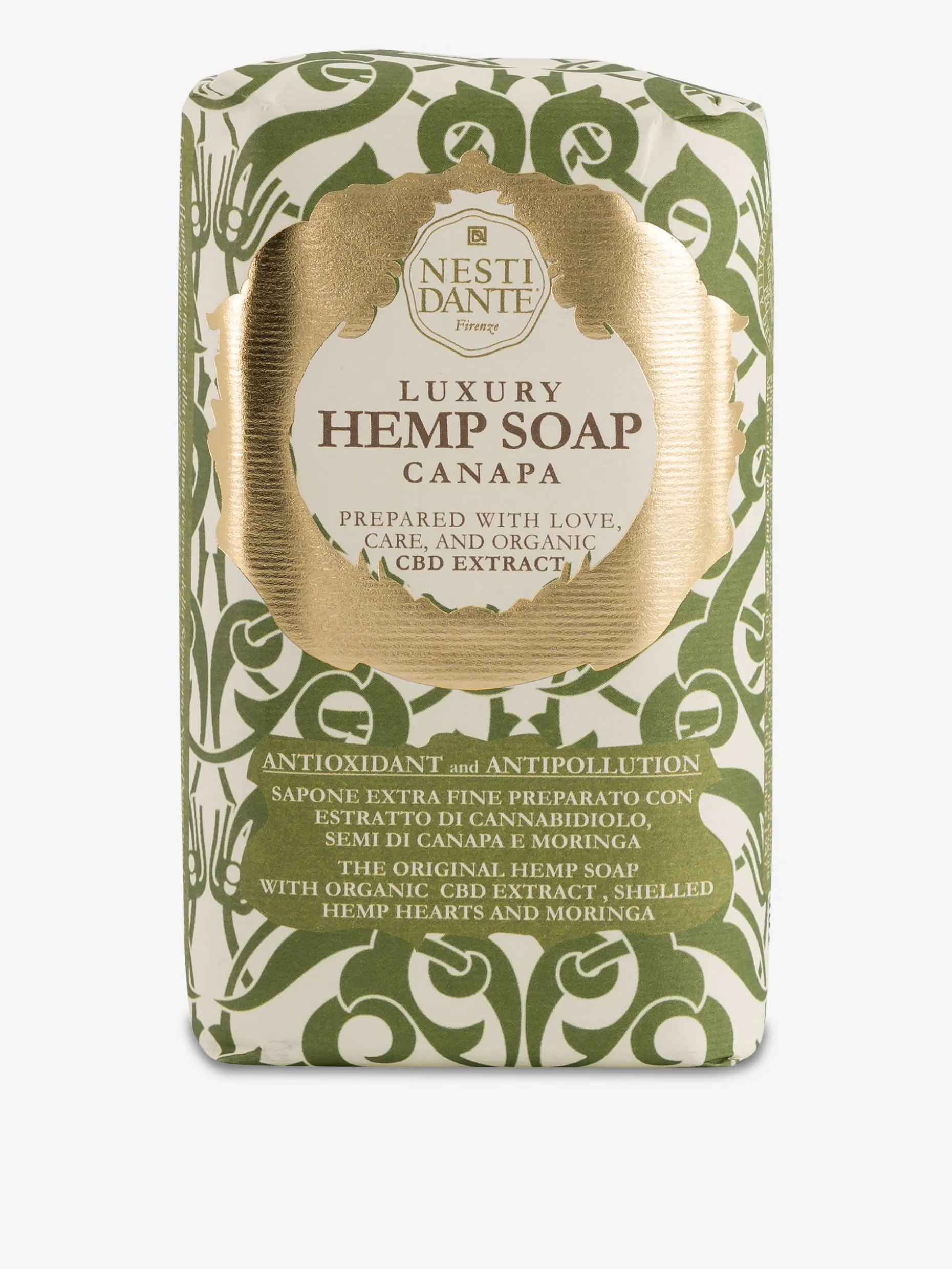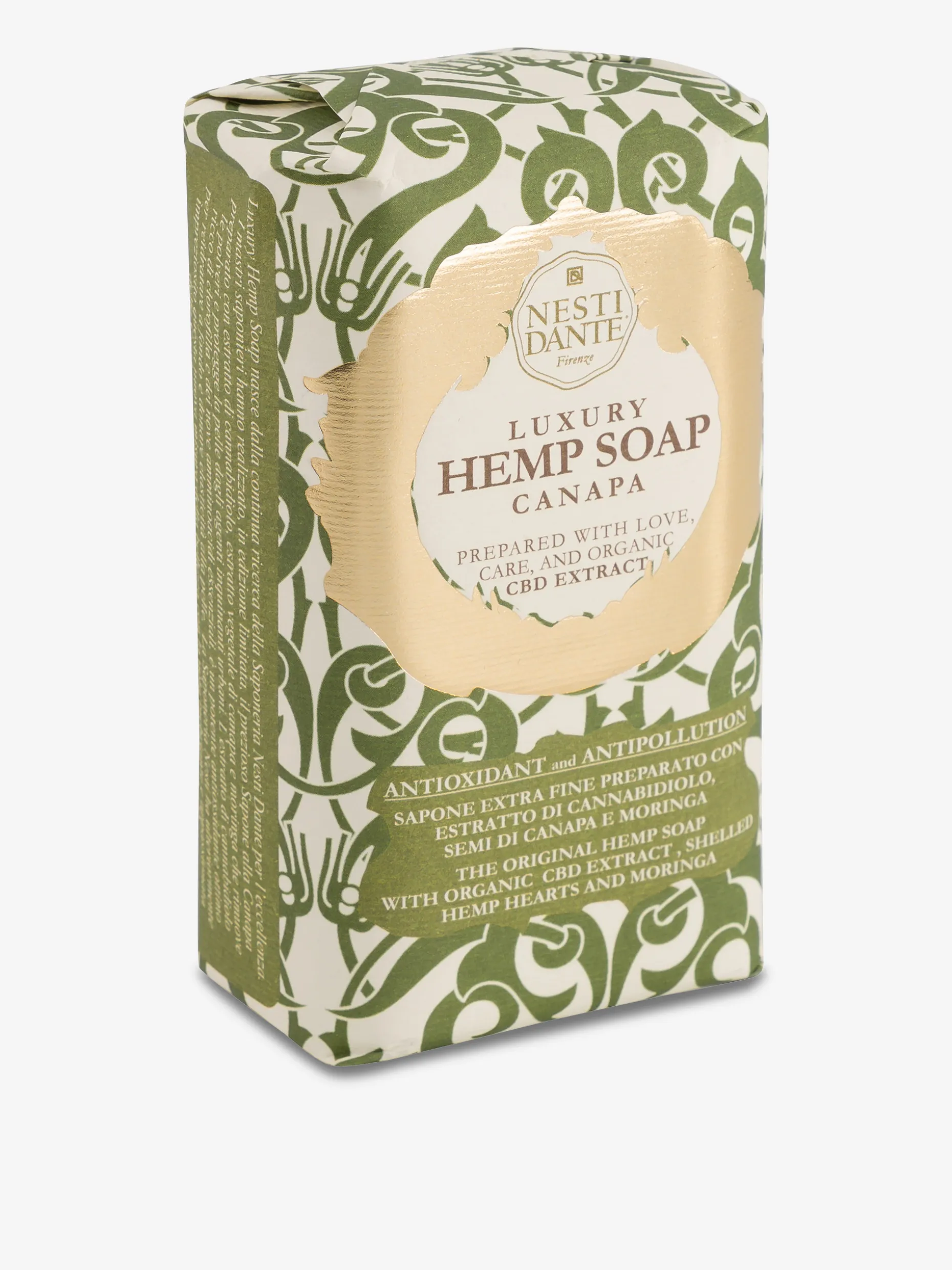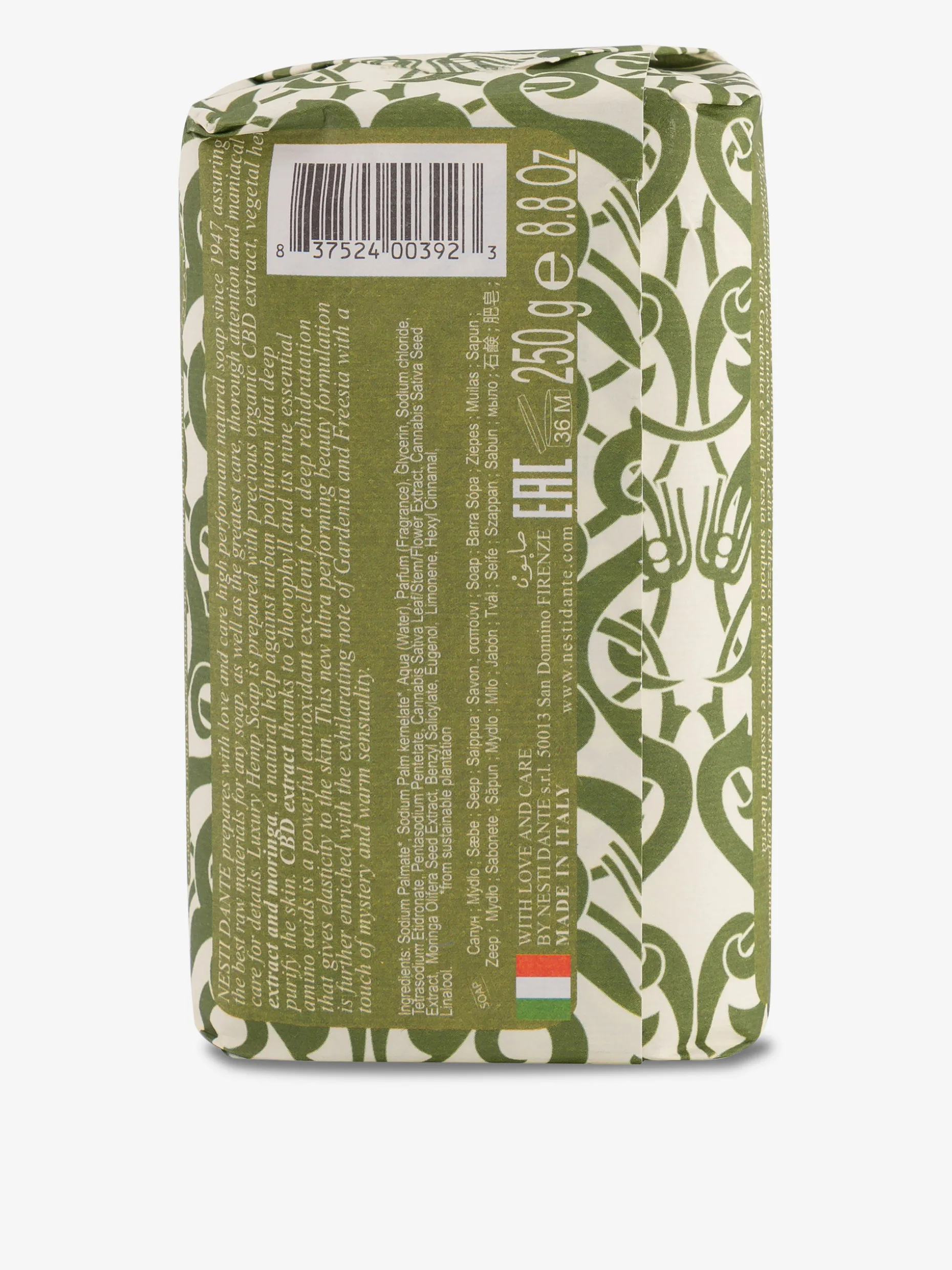Savon chanvre à bas d’extrait de CBD organique, de chanvre végétal et de moringa, renforce naturellement la protection contre la polution urbaine et purifie la peau, 250gr, Fabriqué à Florence, Italie, selon les méthodes artisanales de saponification par Nesti Dante, 100 % à base d’ingrédients naturels et végétales, testé dermatologiquement, non testé sur les animaux.