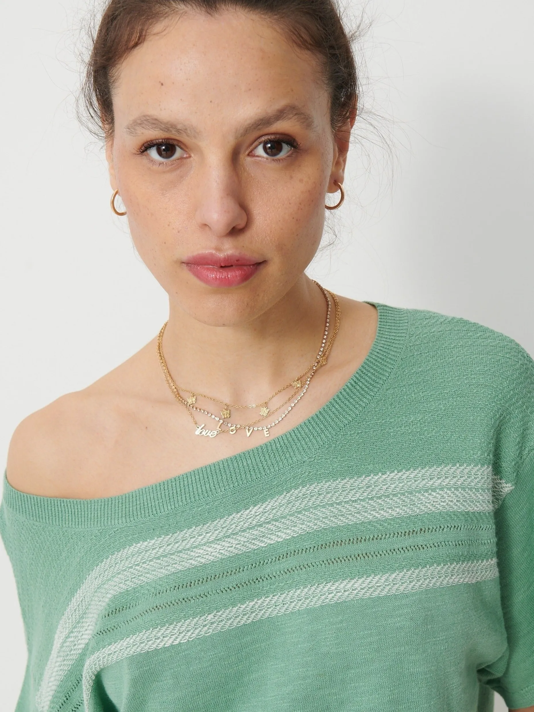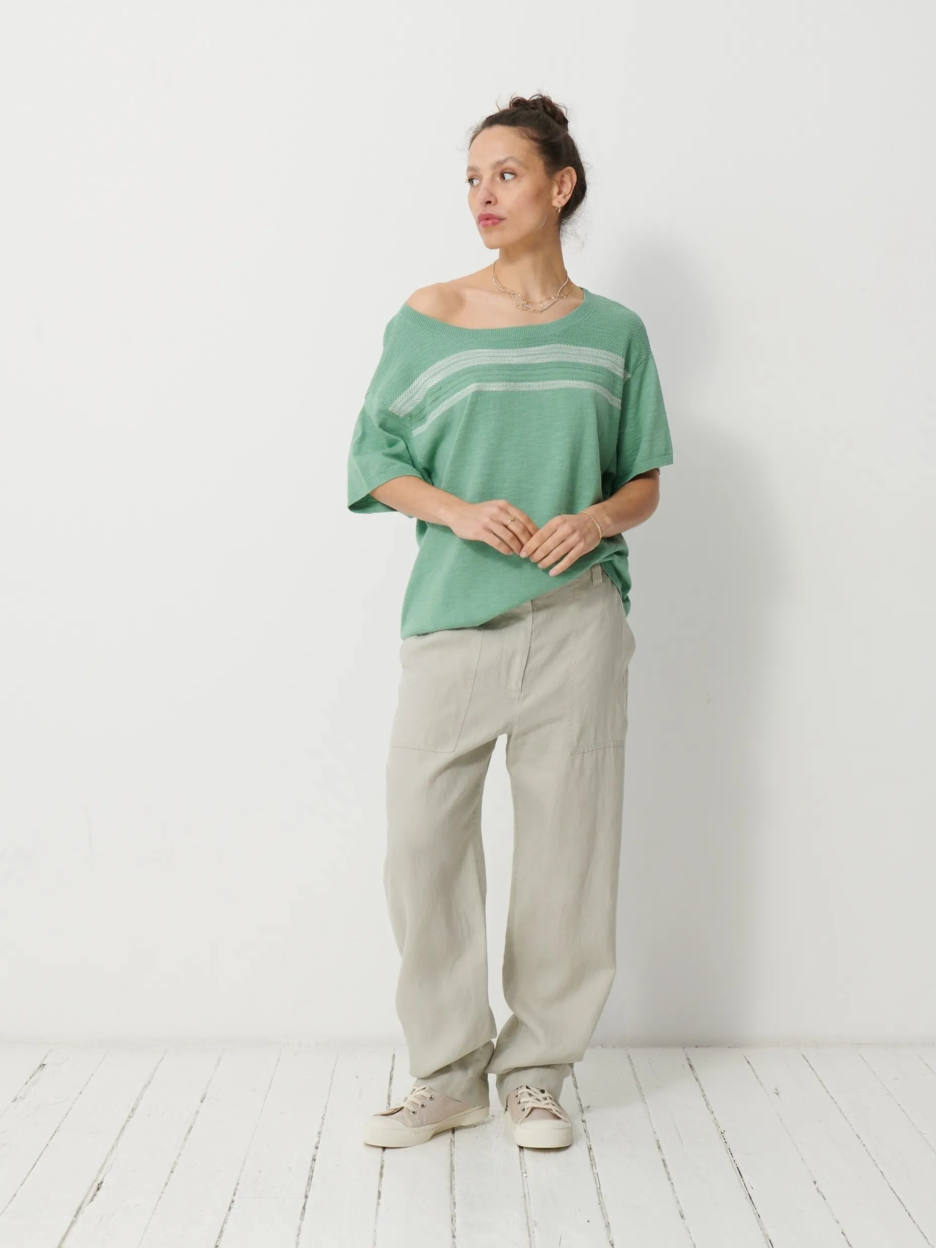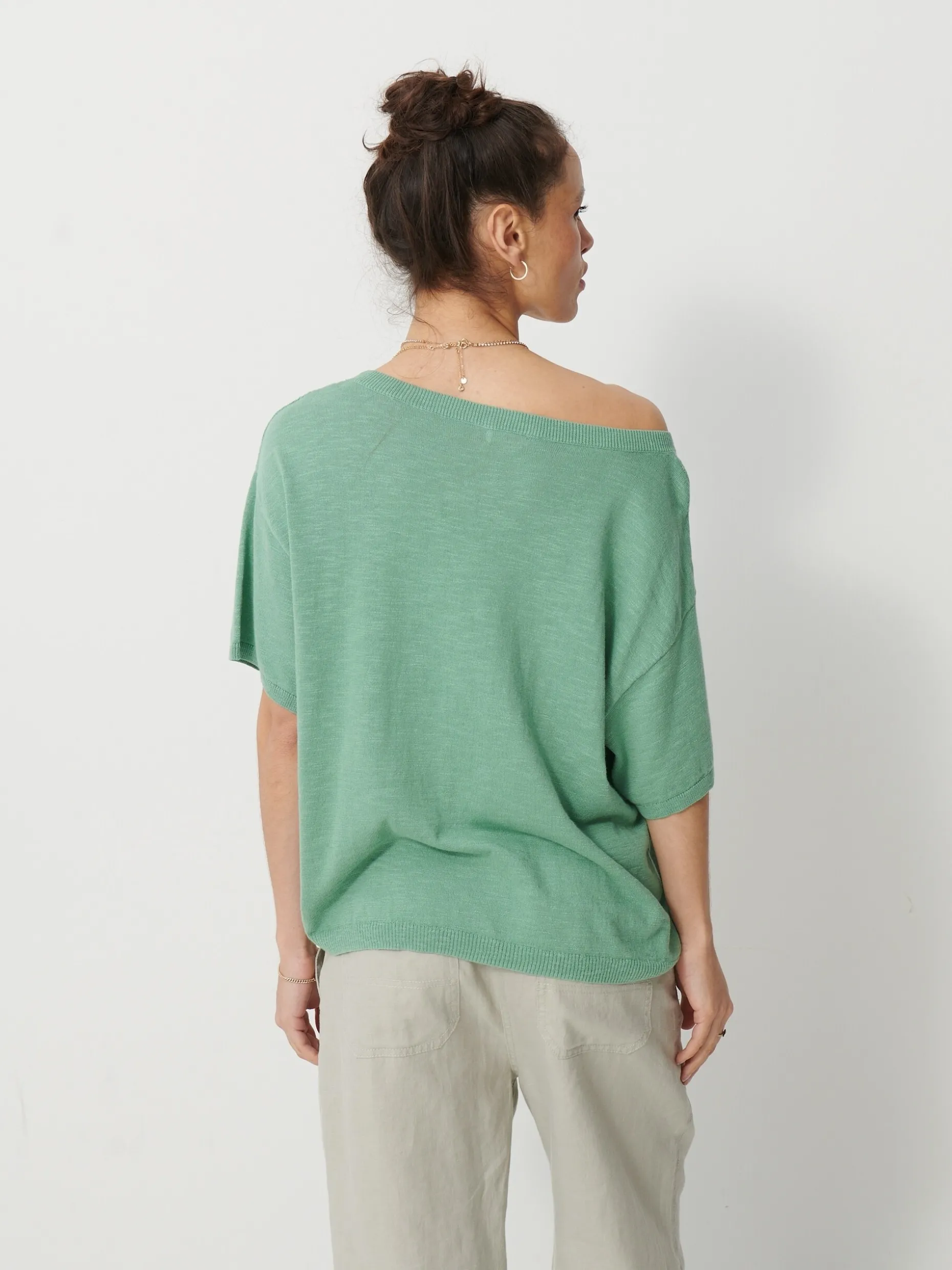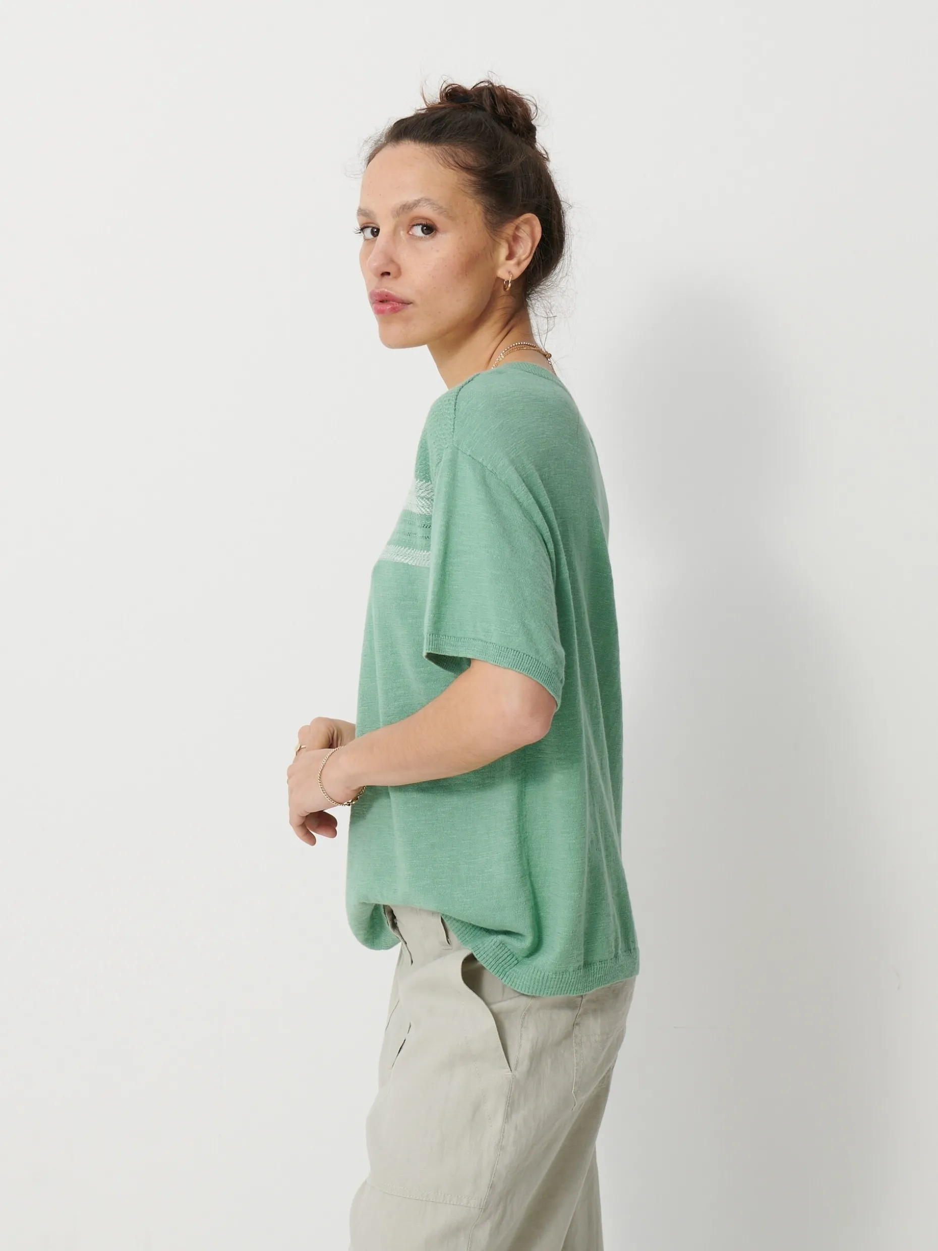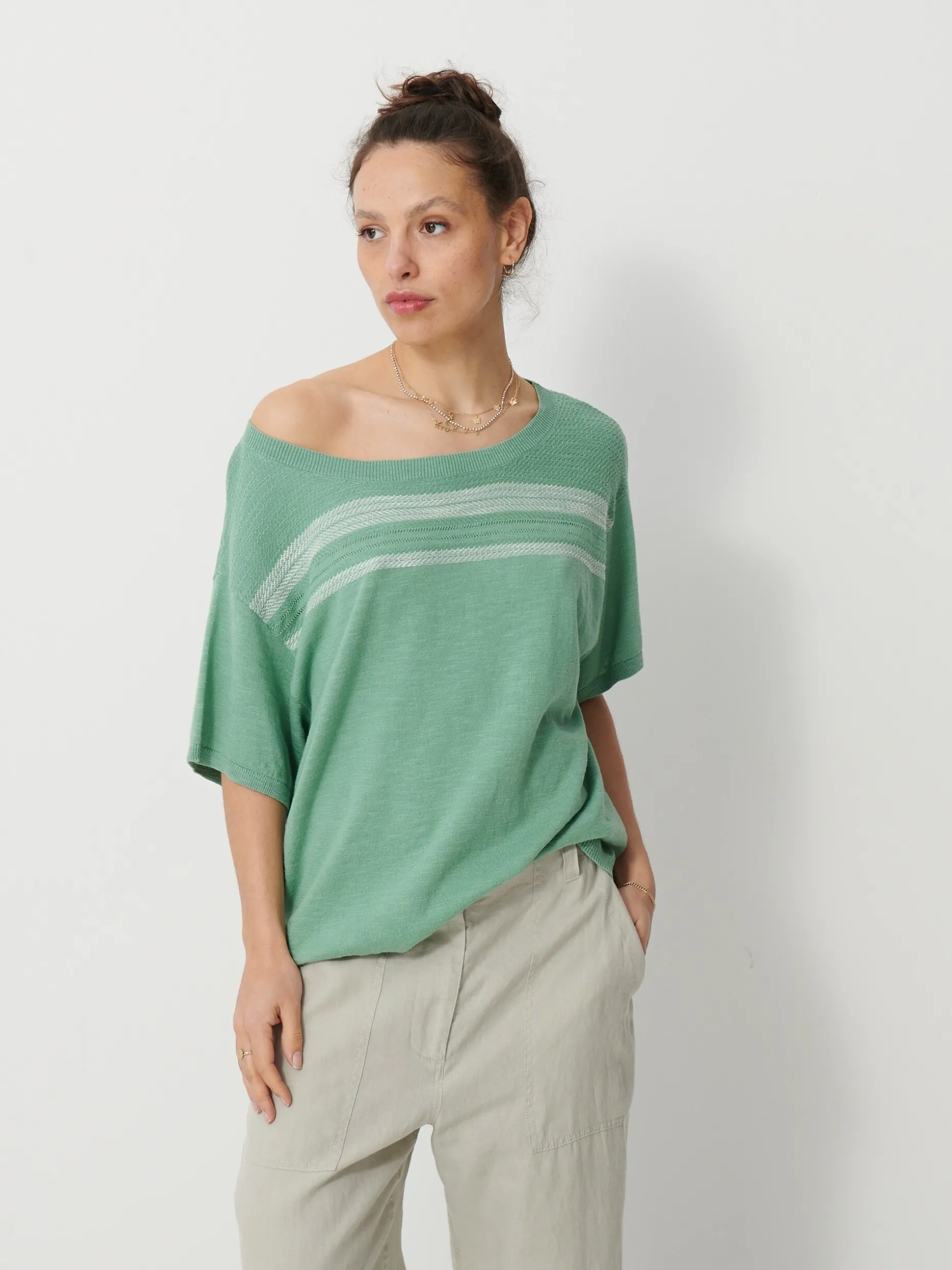 T-shirt Martin à manches courtes et col rond. Volume oversize pour un porter décontracté. Le point fantaisie est assorti de coloris contrastés au niveau de la carrure.