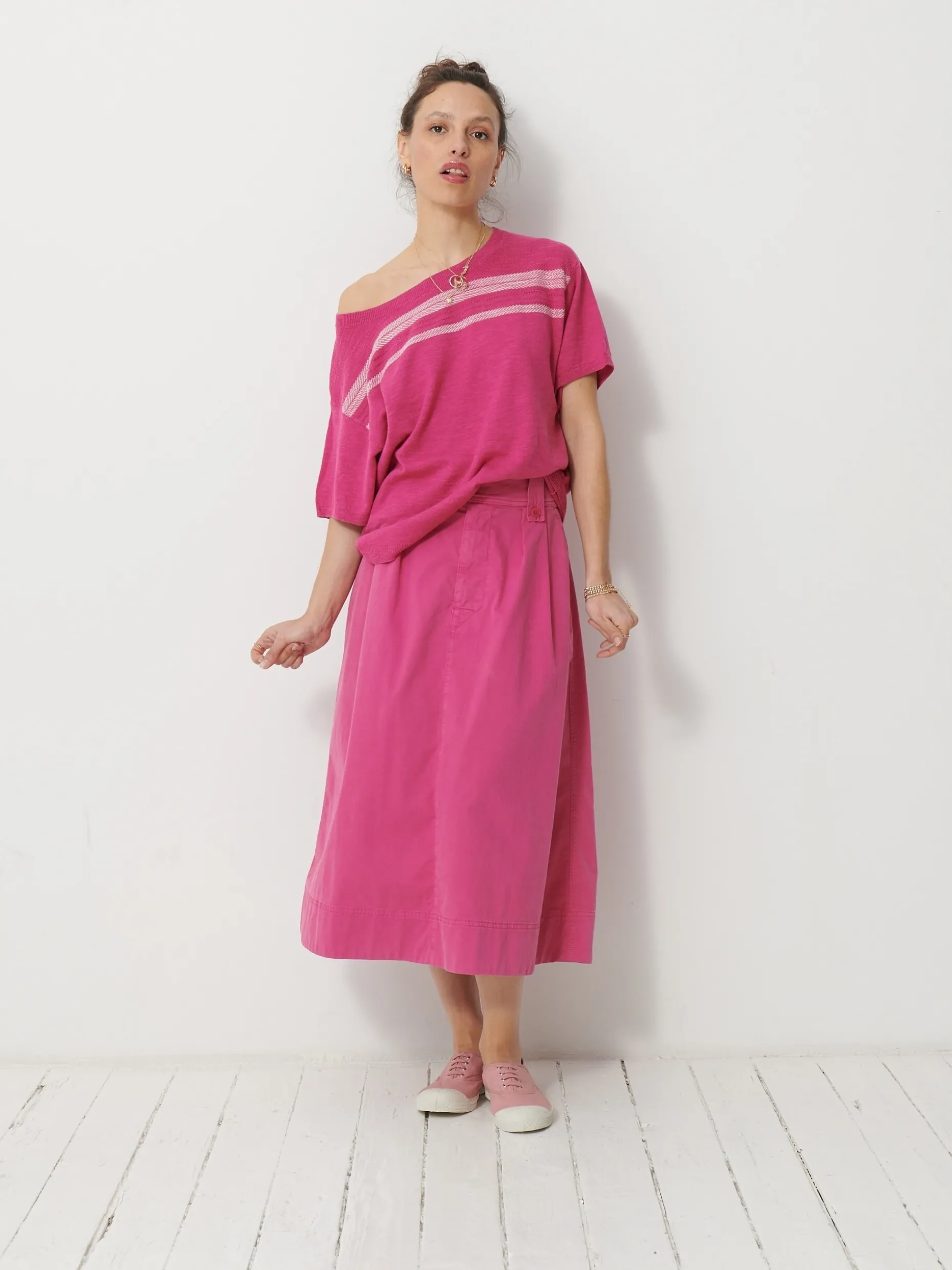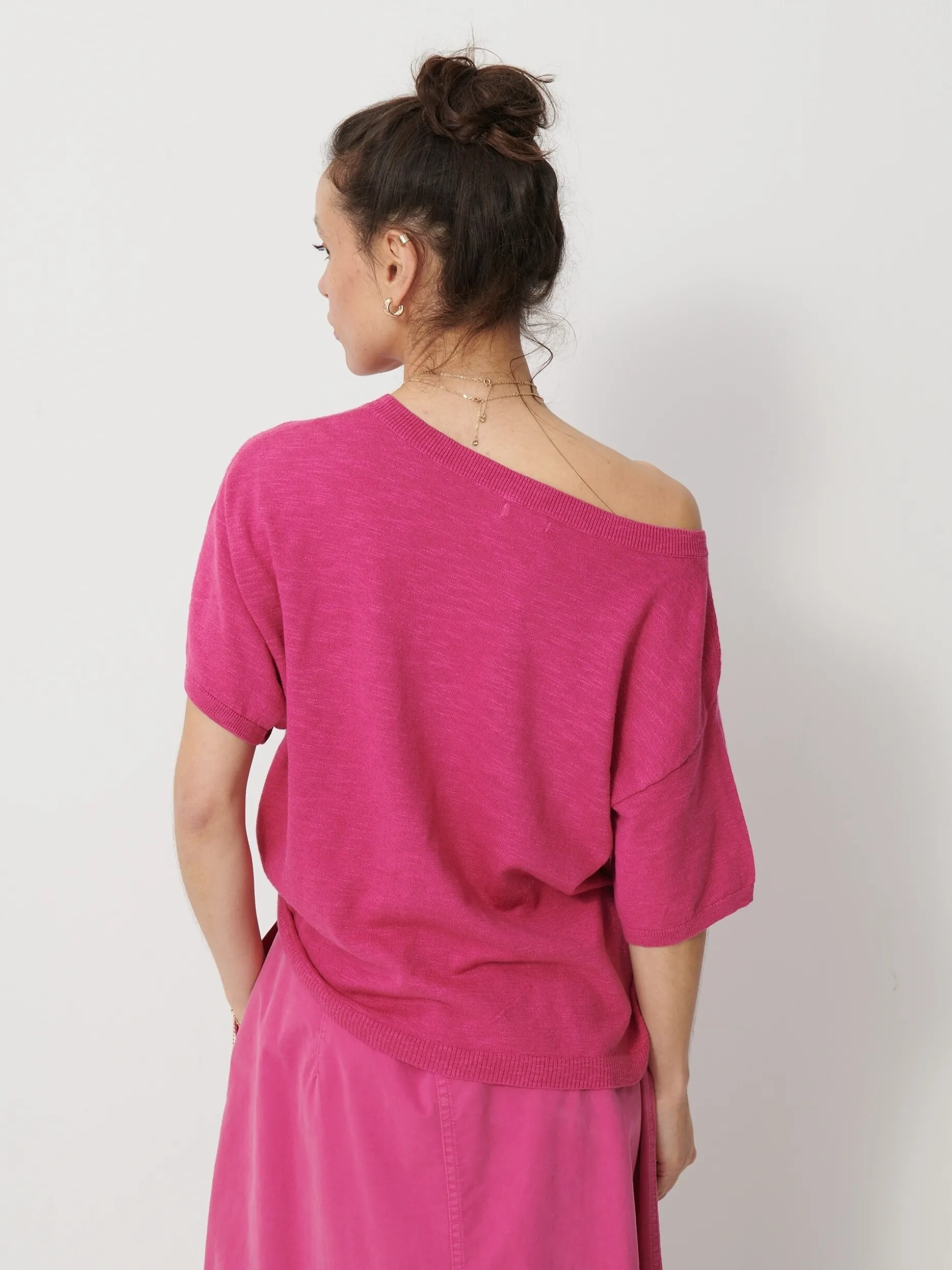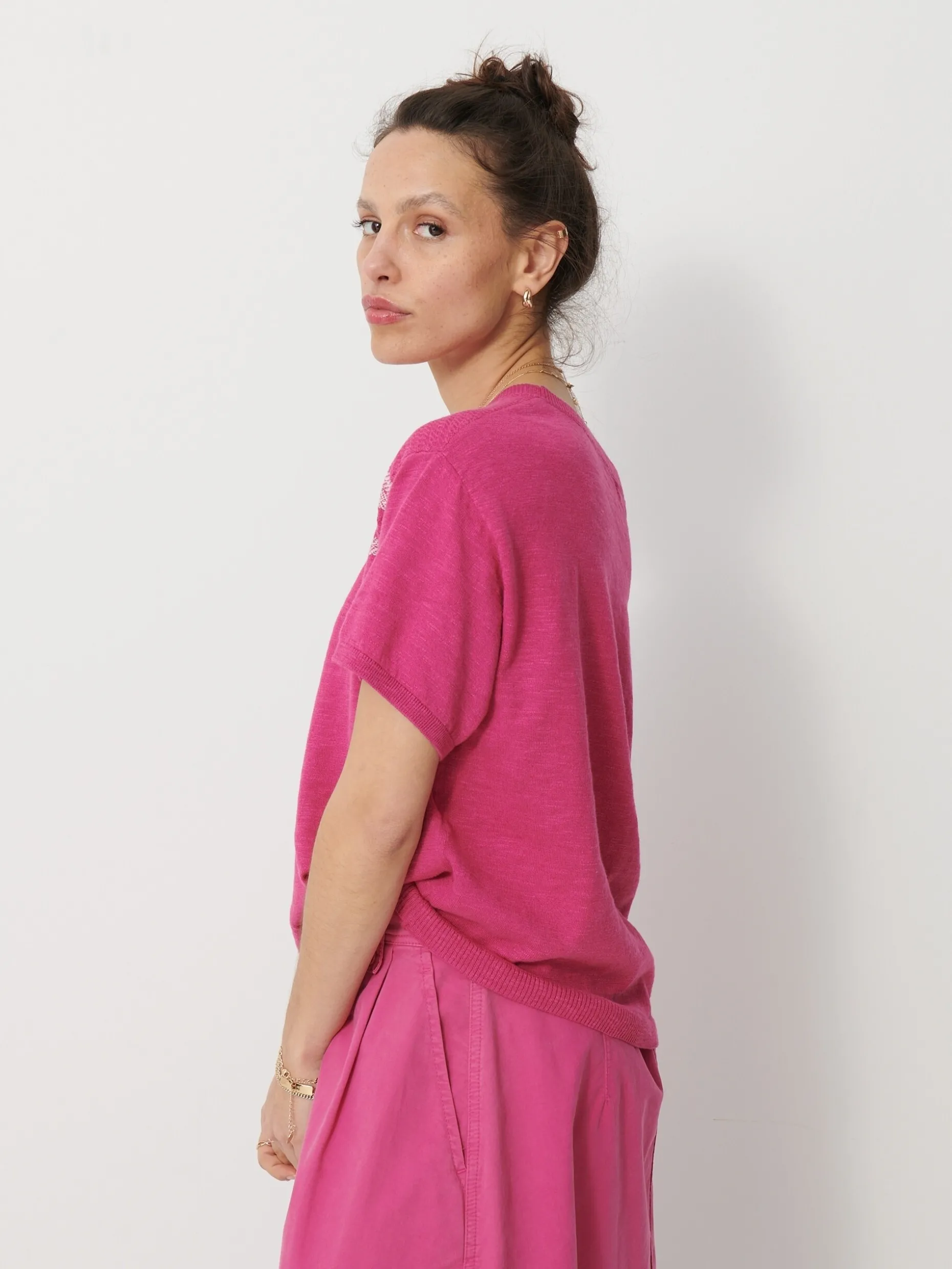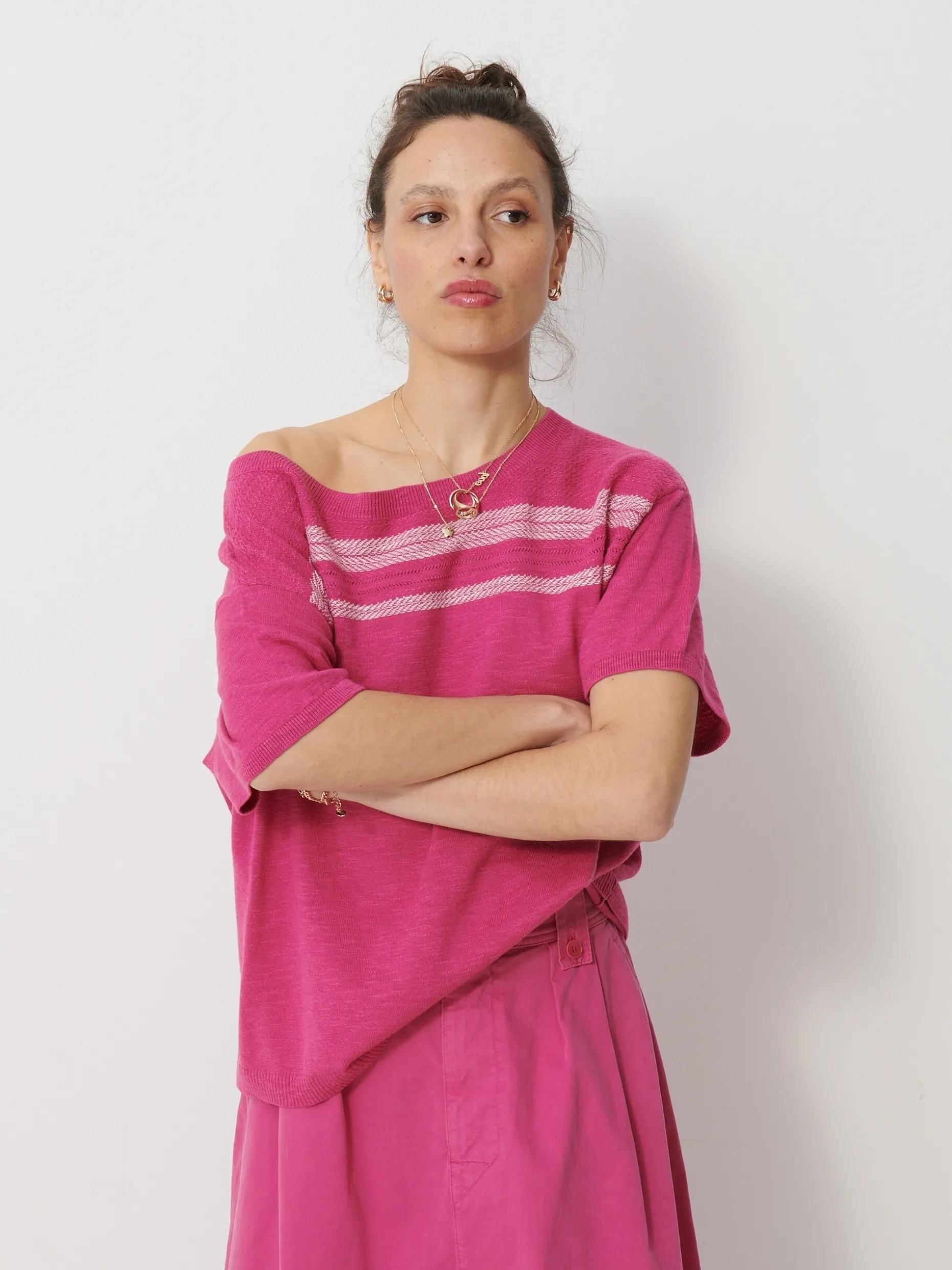 T-shirt Martin à manches courtes et col rond. Volume oversize pour un porter décontracté. Le point fantaisie est assorti de coloris contrastés au niveau de la carrure.