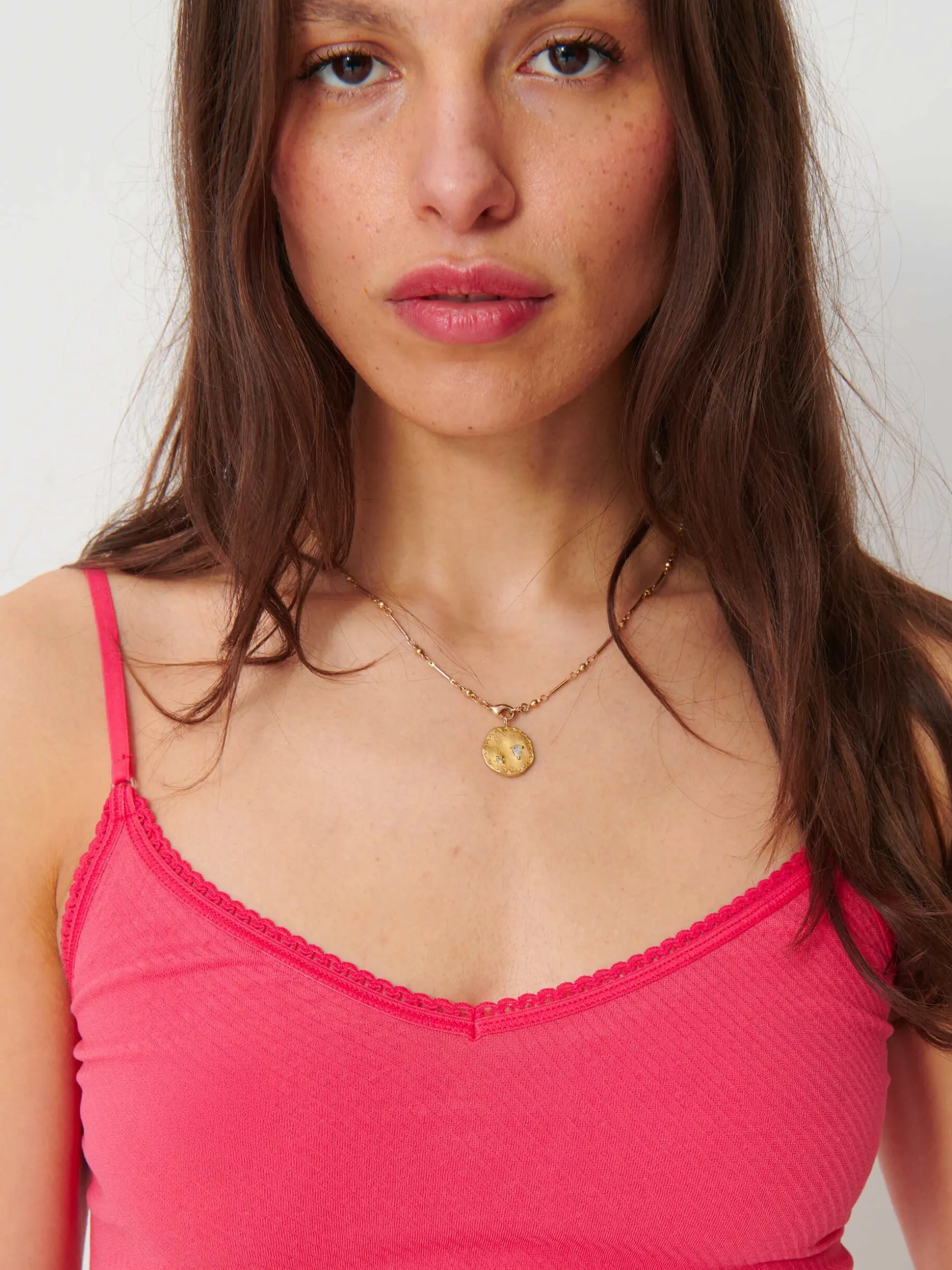 Top lingerie en côtes avec fines bretelles réglables. Le décolleté est orné d’un bord festonné. Des jeux de côtes en diagonale ajoutent une touche graphique.